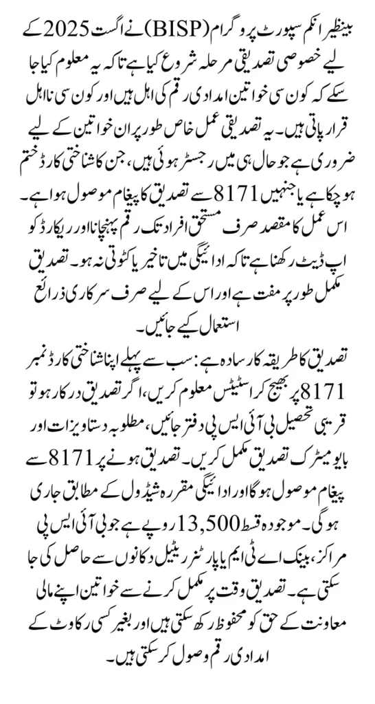 BISP 8171 Verification February 2025 to Identify Eligible and Ineligible Women for Payments. The BISP 8171 February 2026 Verification is a key process to ensure that financial aid continues to reach the most deserving low-income families in Pakistan. This year, the verification drive focuses on identifying women who are eligible to receive Rs. 13,500 payments and those who no longer qualify.
